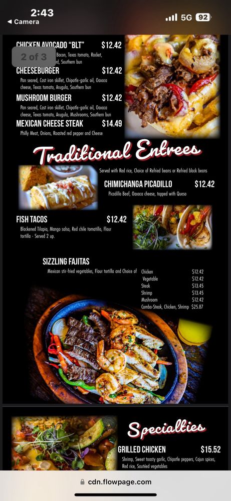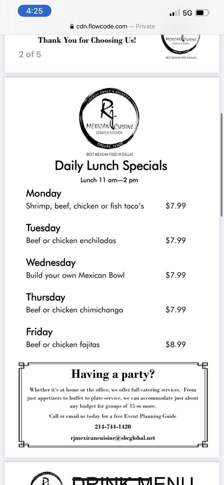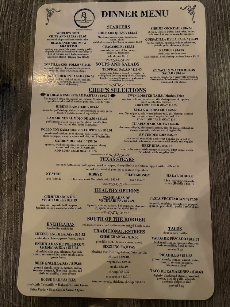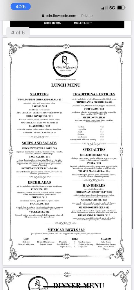 Rj Mexican Cuisine offers a variety of delicious options in a classy yet casual setting. With a full bar, outdoor seating, and free Wi-Fi, it's the perfect place for lunch or dinner. The menu features mouth-watering starters like Cheese Fries, Chile Con Queso, and Hand Rolled Flautas. For handheld options, try the Chicken Avocado BLT or the Mushroom Burger. And don't miss out on their flavorful soups and salads, like the Smoked Chicken Salad or Taco Salad. With options for vegetarians and meat lovers alike, Rj Mexican Cuisine provides a memorable dining experience with excellent service. Don't forget to take advantage of their delivery and catering services for your next event. Whether you're craving traditional Mexican flavors or a modern twist, Rj Mexican Cuisine has something for everyone.